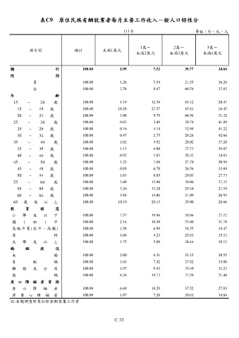 表C9 原住民族有酬就業者每月主要工作收入-按人口特性分