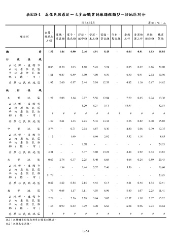 表E18-1 原住民族最近一次參加職業訓練課程類型-按地區別分