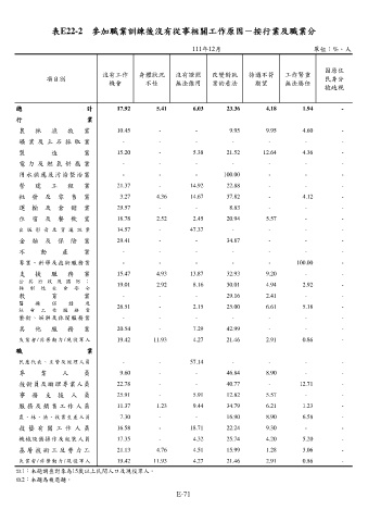 表E22-2 參加職業訓練後沒有從事相關工作原因-按行業及職業分