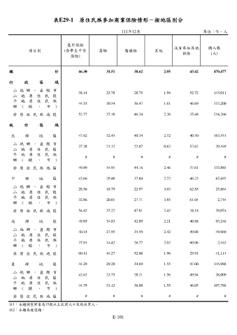 表E29-1 原住民族參加商業保險情形-按地區別分