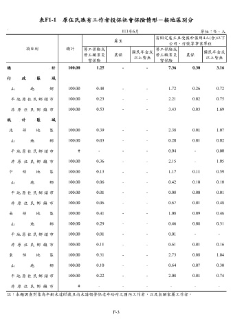 表F1-1 原住民族有工作者投保社會保險情形-按地區別分