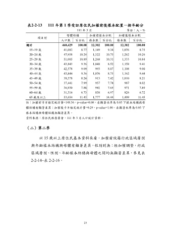 表2-2-13 111 年第 1 季受訪原住民加權前後樣本配置-按年齡分