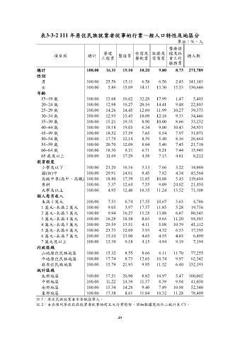 表3-3-2 111 年原住民族就業者從事的行業-按人口特性及地區分