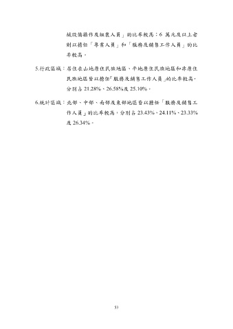 械設備操作及組裝人員」的比率較高;6 萬元及以上者 則以擔任「專業人員」和「服務及銷售工作人員」的比 率較高。 5.行政區域:居住在山地原住民族地區、平地原住民族地區和非原住 民族地區皆以擔任「服務及銷售工作人員」的比率較高, 分別占 21.28%、26.58%及 25.10%。 6.統計區域:北部、中部、南部及東部地區皆以擔任「服務及銷售工 作人員」的比率較高,分別占 23.43%、24.11%、23.33% 及 26.34%。 53