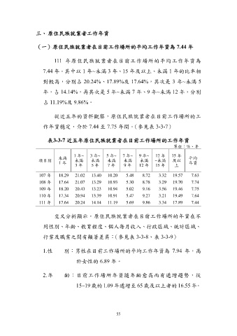 (一)原住民族就業者在目前工作場所的平均工作年資為 7.44 年