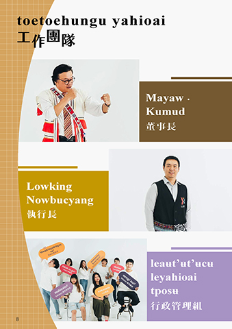 toetoehungu yahioai 工 作 團 隊 Mayaw ・ Kumud 董事長 Lowking Nowbucyang 執行長 leaʉt’ʉt’ʉcʉ leyahioai tposʉ 行政管理組 8