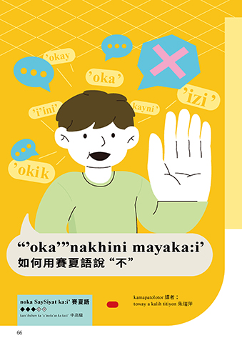 ’okay ’oka’ ’izi’ ’i’ini’ kayni’ ’okik “’oka’”nakhini mayaka:i’ 如何用賽夏語說“不” kamapatolotor 譯者: noka SaySiyat ka:i’ 賽夏語 toway a kalih titiyon 朱瑞萍 kam’ibabaw ka ’a’inola’an ka ka:i’ 中高級 66