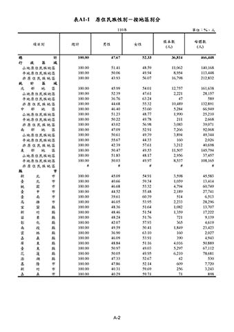 平地原住民族地區 100.00 50.03 49.97 8,537 108,165
