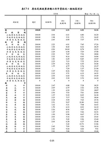 表C7-1 原住民族就業者總工作年資狀況-按地區別分