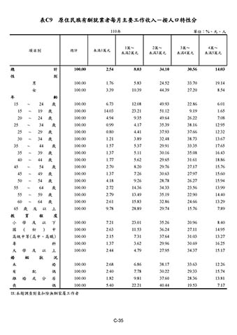 表C9 原住民族有酬就業者每月主要工作收入-按人口特性分