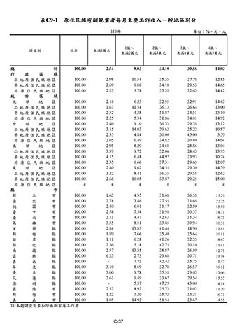 表C9-1 原住民族有酬就業者每月主要工作收入-按地區別分