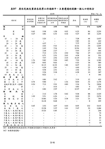 表D7 原住民族失業者在找尋工作過程中,主要遭遇的困難-按人口特性分