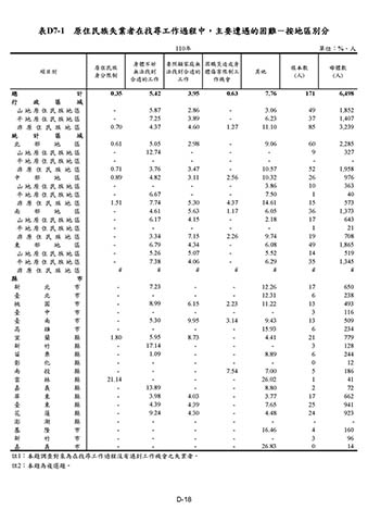 表D7-1 原住民族失業者在找尋工作過程中,主要遭遇的困難-按地區別分