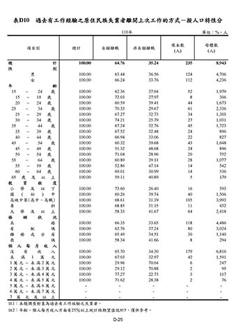 表D10 過去有工作經驗之原住民族失業者離開上次工作的方式-按人口特性分