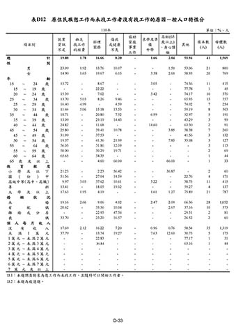 表D12 原住民族想工作而未找工作者沒有找工作的原因-按人口特性分