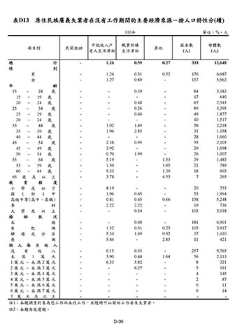 表D13 原住民族廣義失業者在沒有工作期間的主要經濟來源-按人口特性分(續)