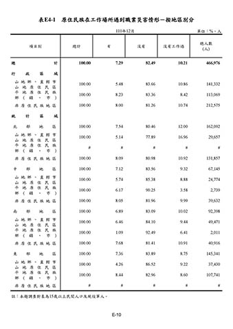 表E4-1 原住民族在工作場所遇到職業災害情形-按地區別分
