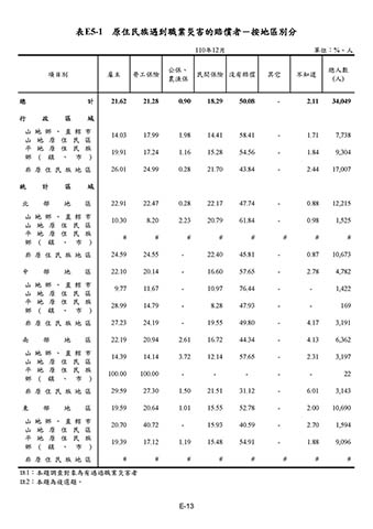 表E5-1 原住民族遇到職業災害的賠償者-按地區別分