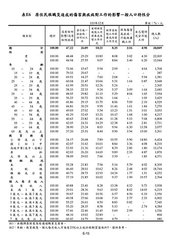 表E6 原住民族職災造成的傷害與疾病對工作的影響-按人口特性分