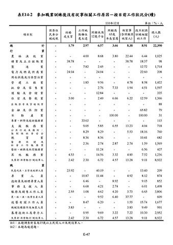 表E14-2 參加職業訓練後沒有從事相關工作原因-按目前工作狀況分(續)