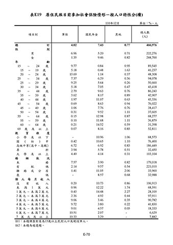 表E19 原住民族目前參加社會保險情形-按人口特性分(續)