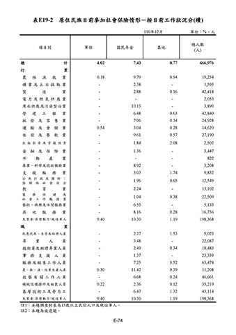 表E19-2 原住民族目前參加社會保險情形-按目前工作狀況分(續)