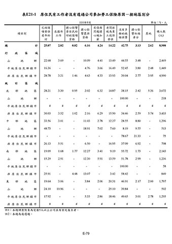 表E21-1 原住民有工作者沒有透過公司參加勞工保險原因-按地區別分
