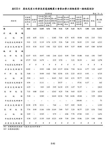 表E22-1 原住民有工作者沒有透過職業工會參加勞工保險原因-按地區別分