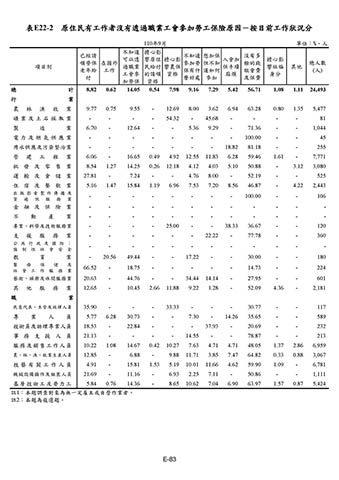表E22-2 原住民有工作者沒有透過職業工會參加勞工保險原因-按目前工作狀況分