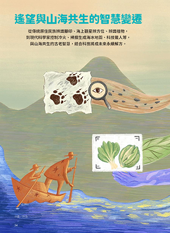 遙望與山海共生的智慧變遷 從傳統原住民族辨識腳印、海上觀星辨方位、辨識植物, 到現代科學家控制冷火、掃描生成海冰地圖、科技獵人等, 與山海共生的古老智慧,結合科技將成未來永續解方。 插畫/陳盈 34 ܆݂ࠦԫ JOEE ܆݂ࠦԫ JOEE