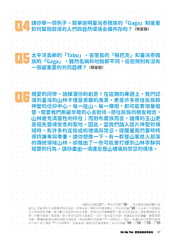 37 的永續發展與和諧共存」。Q6_ 開放式作答,注重對題目的理解。 依賴這片土地生活。Q5_ 開放式作答,注重對題目的理解。參考解答:這些規則最重要的共同目標是「社群 土地和樹靈溝通,取得祂們的同意。這種尊重自然的態度,確保了森林資源的永續利用,讓部落能夠長久地 過度獵捕,讓動物有時間繁殖,維持生態平衡。此外,在開墾土地或砍伐樹木前,泰雅族人會舉行儀式,與 和自然資源之間的關係。例如,在狩獵時 Gaga 會規定狩獵的季節、區域和可捕捉的動物種類與數量,避免 Q1_C。Q2_D。Q3_A。Q4_ 開放式作答,注重對題目的理解。參考解答:泰雅族的 Gaga 規範了族人與土地