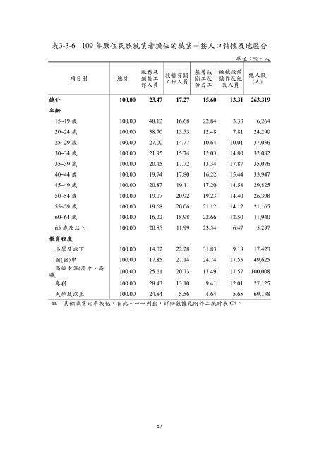 表3-3-6 109 年原住民族就業者擔任的職業-按人口特性及地區分