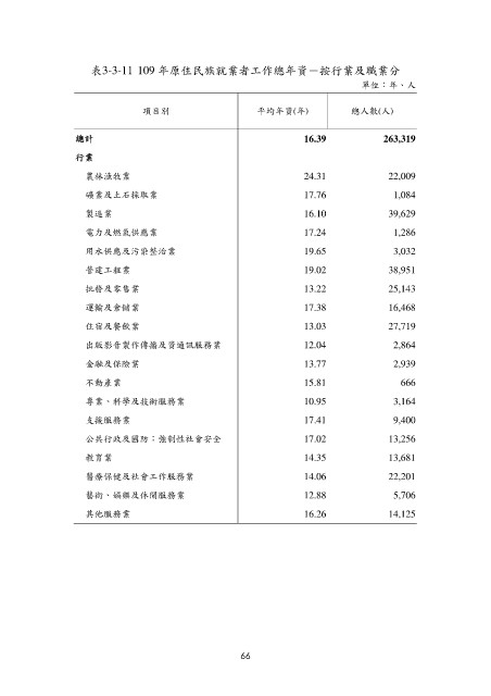 表3-3-11 109 年原住民族就業者工作總年資-按行業及職業分