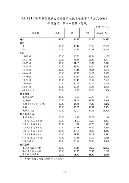 表3-3-15 109 年原住民族受政府僱用之就業者是否具有正式公務員