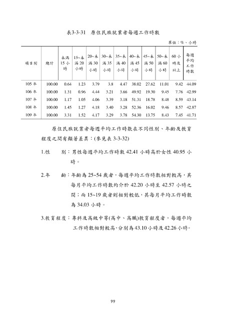 表3-3-31 原住民族就業者每週工作時數