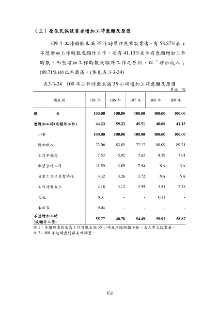 表3-3-34 109 年工作時數未滿 35 小時增加工時意願及原因