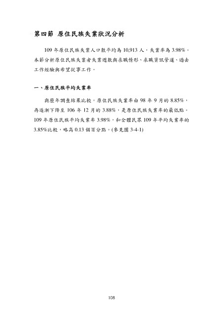 109 年原住民族失業人口數平均為 10,913 人,失業率為 3.98%。