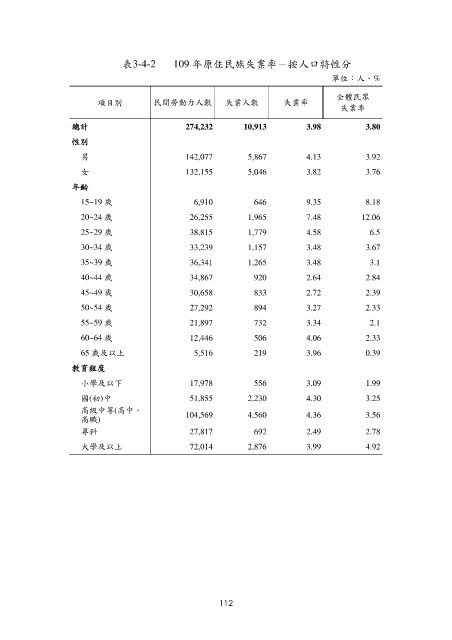 表3-4-2 109 年原住民族失業率-按人口特性分