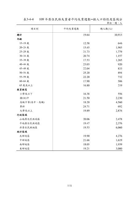 表3-4-4 109 年原住民族失業者平均失業週數─按人口特性及區域分