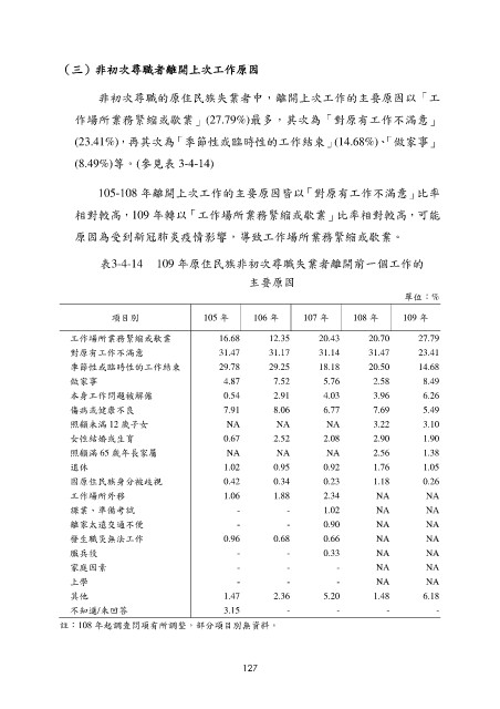 表3-4-14 109 年原住民族非初次尋職失業者離開前一個工作的