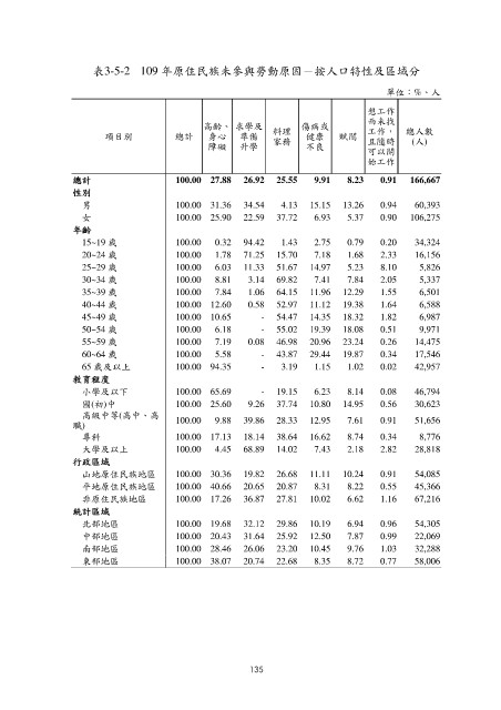 表3-5-2 109 年原住民族未參與勞動原因-按人口特性及區域分