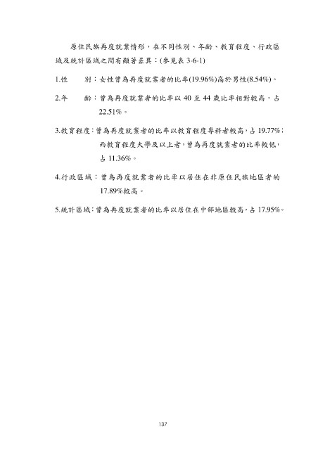 原住民族再度就業情形,在不同性別、年齡、教育程度、行政區