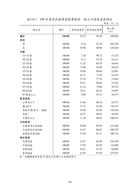 表3-6-1 109 年原住民族再度就業情形-按人口特性及區域分