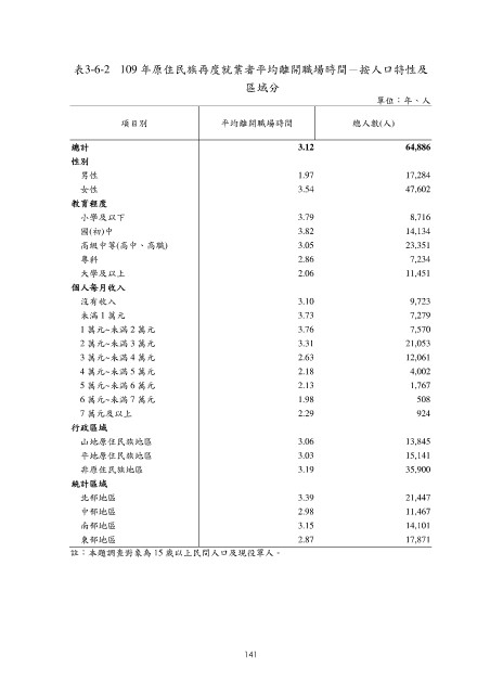 表3-6-2 109 年原住民族再度就業者平均離開職場時間-按人口特性及