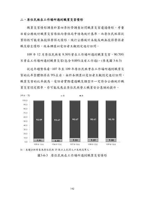 109 年 12 月原住民族有 9.30%曾在工作場所遇到職業災害,90.70%