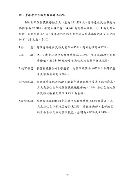 1.性 別:男性青年原住民族失業率 4.85%,高於女性的 4.77%。