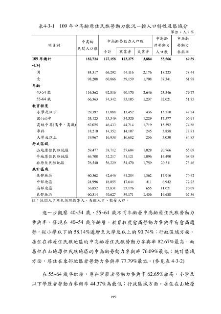 表4-3-1 109 年中高齡原住民族勞動力狀況-按人口特性及區域分