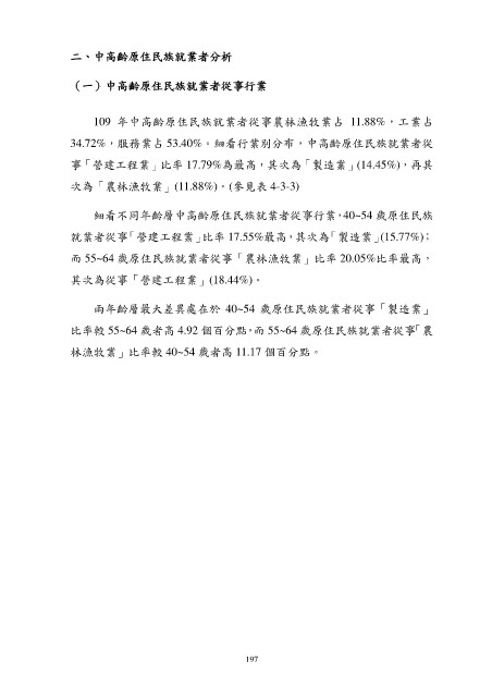 比率較 55~64 歲者高 4.92 個百分點,而 55~64 歲原住民族就業者從事「農