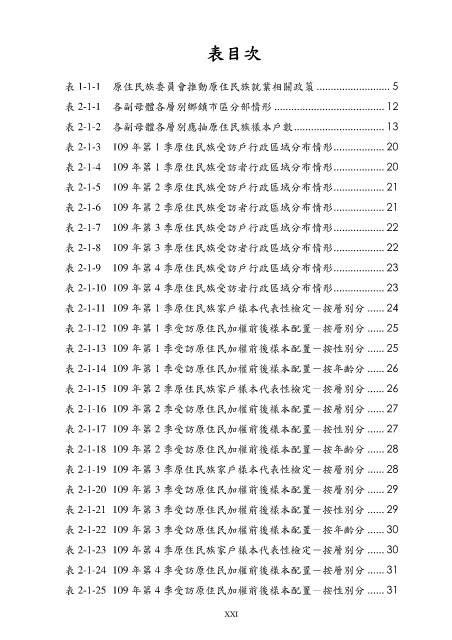 表 2-1-24 109 年第 4 季受訪原住民加權前後樣本配置-按層別分 ...... 31