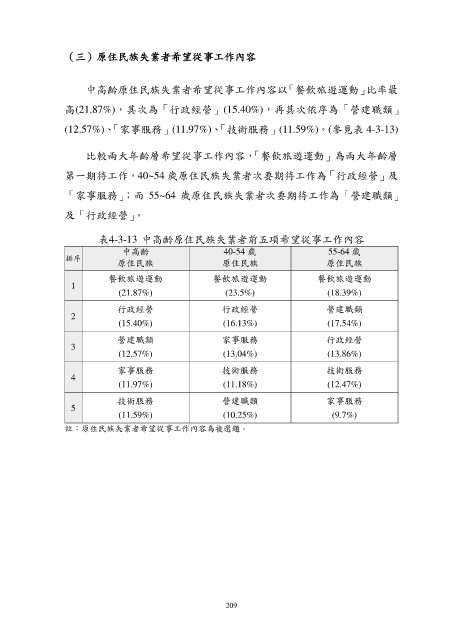 表4-3-13 中高齡原住民族失業者前五項希望從事工作內容